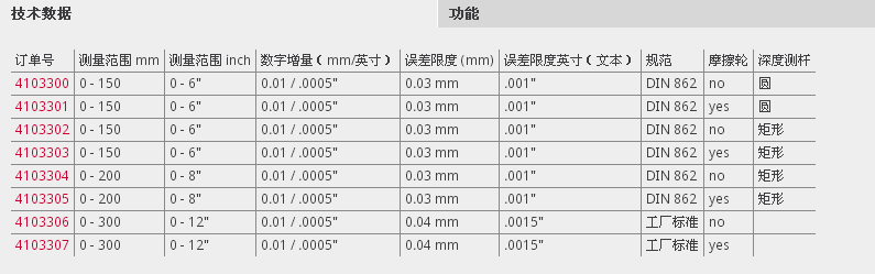 | 訂單號(hào) | 測(cè)量范圍 mm | 測(cè)量范圍 inch | 數(shù)字增量(mm/英寸) | 誤差限度 (mm) | 誤差限度英寸(文本) | 規(guī)范 | 摩擦輪 | 深度測(cè)桿 |